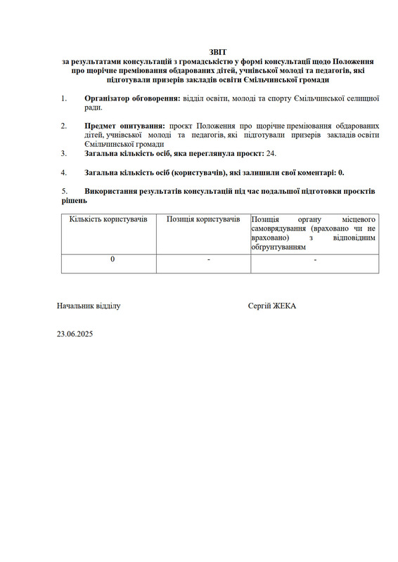 Громадське обговорення у формі електронної консультації проєкту Положення про щорічне преміювання обдарованих дітей, учнівської молоді та педагогів, які підготували призерів закладів освіти Ємільчинської громади проводиться у відповідності до рішення виконавчого комітету Ємільчинської селищної ради від 14.12.22 року №162 «Про затвердження Положення про публічні електронні консультації з громадськістю з питань, віднесених до компетенції органів місцевого самоврядування в Ємільчинській територіальній громаді».