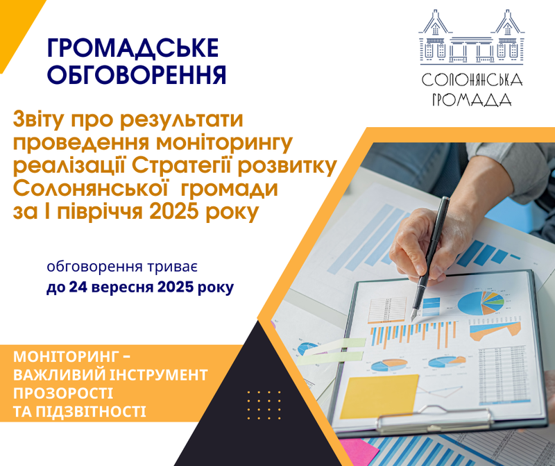 Розпочинається громадське обговорення проєкту рішення «Про затвердження звіту про результати проведення моніторингу реалізації Стратегії розвитку Солонянської селищної територіальної громади на 2022–2027 роки за І півріччя 2025 року».