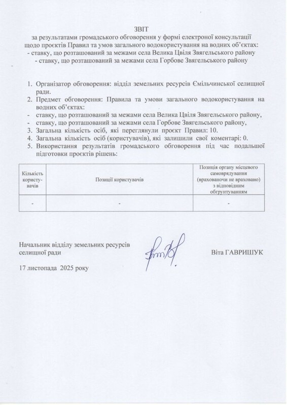 Громадське обговорення у формі електронної консультації проєкту Правил та умов загального водокористування на водних об’єктах: ставках, які розташовані за межами сіл Горбове та Велика Цвіля Звягельського району Житомирської області, проводиться у відповідності до рішення виконавчого комітету Ємільчинської селищної ради від 14.12.22 року №162 «Про затвердження Положення про публічні електронні консультації з громадськістю з питань, віднесених до компетенції органів місцевого самоврядування в Ємільчинській територіальній громаді».