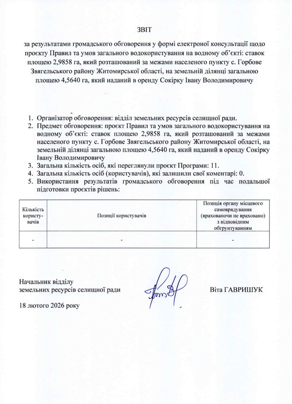 Громадське обговорення у формі електронної консультації проєкту Правил та умов загального водокористування на водному об’єкті: ставку, що розташований за межами села Горбове Звягельського району Житомирської області проводиться у відповідності до рішення виконавчого комітету Ємільчинської селищної ради від 14.12.22 року №162 «Про затвердження Положення про публічні електронні консультації з громадськістю з питань, віднесених до компетенції органів місцевого самоврядування в Ємільчинській територіальній громаді».