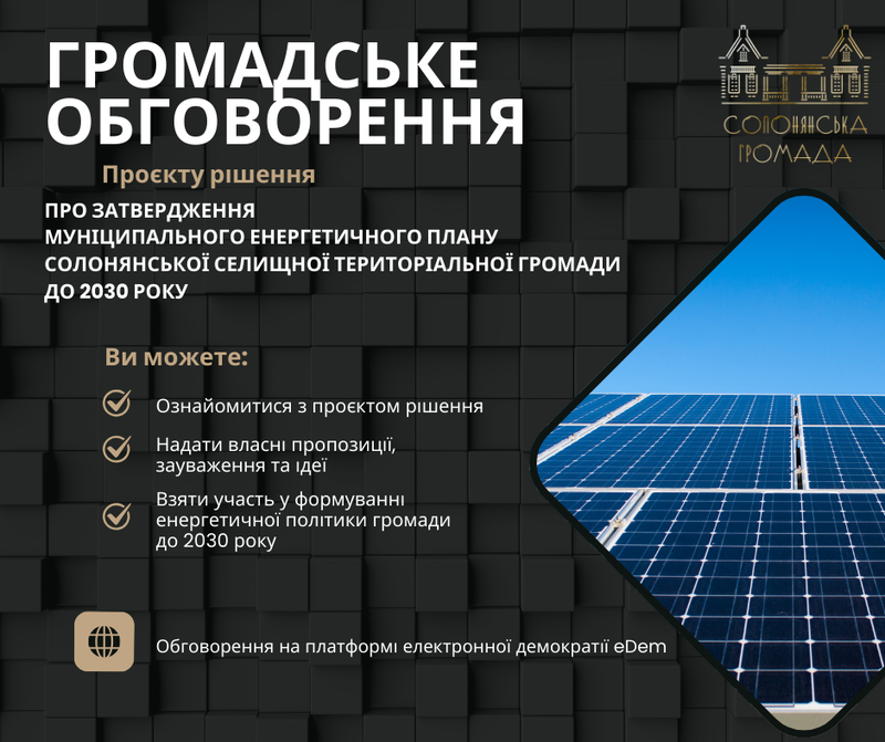 Відповідно до Методики розроблення місцевих енергетичних планів та з дотриманням процедур, визначених чинним законодавством, оголошується громадське обговорення проєкту Муніципального енергетичного плану Солонянської селищної територіальної громади до 2030 року.