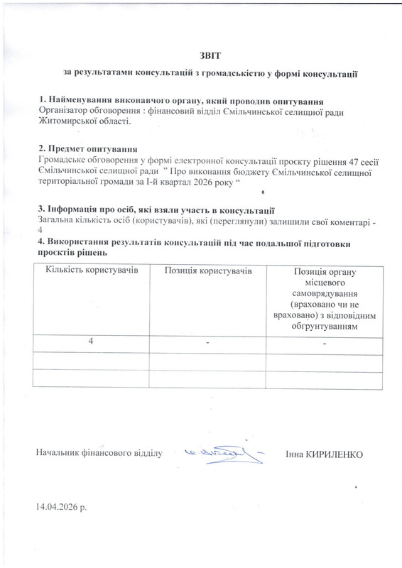 Громадське обговорення у формі електронної консультації проекту рішення 47 сесії Ємільчинської селищної ради ” Про виконання бюджету Ємільчинської селищної територіальної громади за І квартал 2026 року “ проводиться у відповідності до рішення виконавчого комітету Ємільчинської селищної ради від 14.12.2022 року №162 “Про затвердження Положення про публічні електронні консультації з громадськістю з питань, віднесених до компетенції органів місцевого самоврядування в Ємільчинській територіальній громаді“.